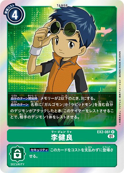 【自分のターン開始時】メモリーが2以下のとき、3にする。【自分のターン】名称に「ガルゴモン」か「ラピッドモン」を含む自分のデジモンがアタックしたとき、このテイマーをレストさせることで、相手のデジモン1体をレストさせる。
