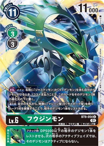 [手札]【メイン】名称に「ジャスティモン」か「ライデンモン」を含む自分のデジモンがいるとき、1コスト支払うことで、このカードをそのデジモン1体の進化元の下に置く。【進化時】自分の手札から、特徴に「マシーン型」か「サイボーグ型」を持つカード1枚を破棄することで、相手のデジモン1体をレストさせる。