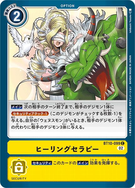 【メイン】次の相手のターン終了まで、相手のデジモン1体に≪セキュリティアタック-1≫(このデジモンがチェックする枚数-1)を与える。自分の「ウェヌスモン」がいるとき、相手のデジモン1体の代わりに相手のデジモン3体に与える。