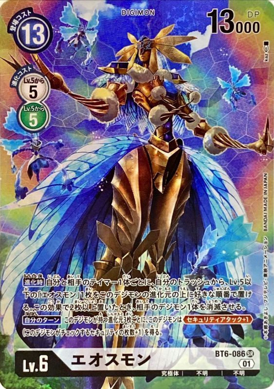 【進化時】自分と相手のテイマー1体ごとに、自分のトラッシュから、Lv.5以下の「エオスモン」1枚をこのデジモンの進化元の上に好きな順番で置ける。この効果で2枚以上置いたとき、相手のデジモン1体を消滅させる。【自分のターン】このデジモンが持つ進化元3枚ごとに、このデジモンは≪セキュリティアタック+1≫(このデジモンがチェックするセキュリティの枚数+1)を得る。