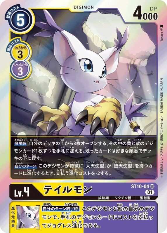 【登場時】自分のデッキの上から3枚オープンする。その中の黄と紫のデジモンカード1枚ずつを手札に加える。残ったカードは好きな順番でデッキの下に戻す。【自分のターン】このデジモンが特徴に「大天使型」か「堕天使型」を持つカードに進化するとき、支払う進化コストを-2する。