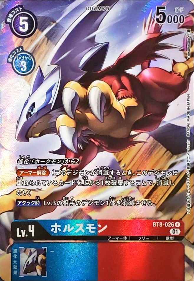 進化:「ホークモン」から2≪アーマー解除≫(このデジモンが消滅するとき、このデジモンに重ねられているカードを上から1枚破棄することで、消滅しない)【アタック時】Lv.3の相手のデジモン1体を消滅させる。