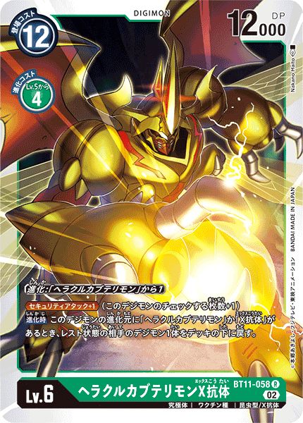 進化:「ヘラクルカブテリモン」から1≪セキュリティアタック+1≫(このデジモンのチェックする枚数+1)【進化時】このデジモンの進化元に「ヘラクルカブテリモン」か「X抗体」があるとき、レスト状態の相手のデジモン1体をデッキの下に戻す。