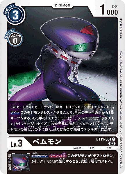 このカードと同じカードナンバーのカードはデッキに50枚まで入れられる。【メイン】このデジモンをレストさせることで、自分のデッキの上から3枚オープンする。その中の「スナッチモン」か「デストロモン」か「ラグナモン」か「フュージョナイズ」1枚を手札に加え、「ベムモン」1枚をこのデジモンの進化元の下に置く。残りは好きな順番でデッキの下に戻す。
