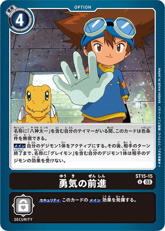 名称に「八神太一」を含む自分のテイマーがいる間、このカードは色条件を無視できる。【メイン】自分のデジモン1体をアクティブにする。その後、相手のターン終了まで、名称に「グレイモン」を含む自分のデジモン1体は相手のデジモンの効果を受けない。