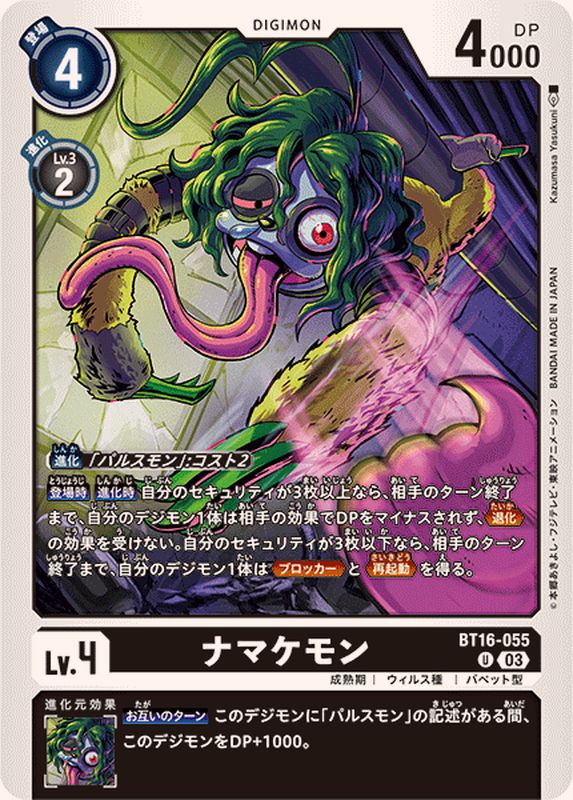 「パルスモン」:コスト2【登場時】【進化時】自分のセキュリティが3枚以上なら、相手のターン終了まで、自分のデジモン1体は相手の効果でDPをマイナスされず、≪退化≫の効果を受けない。自分のセキュリティが3枚以下なら、相手のターン終了まで、自分のデジモン1体は≪ブロッカー≫と≪再起動≫を得る。