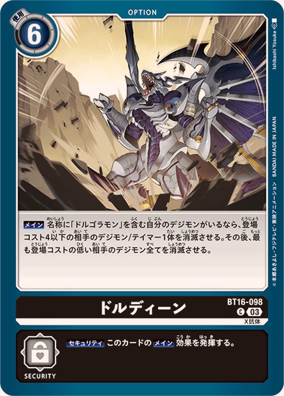 【メイン】名称に「ドルゴラモン」を含む自分のデジモンがいるなら、登場コスト4以下の相手のデジモン/テイマー1体を消滅させる。その後、最も登場コストの低い相手のデジモン全てを消滅させる。