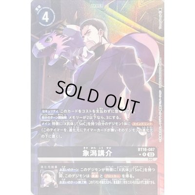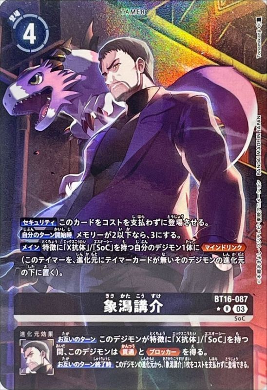 【お互いのターン】このデジモンが特徴に「X抗体」/「SoC」を持つ間、このデジモンは≪貫通≫と≪ブロッカー≫を得る。【お互いのターン終了時】このデジモンの進化元から、「象潟講介」1枚をコストを支払わずに登場できる。