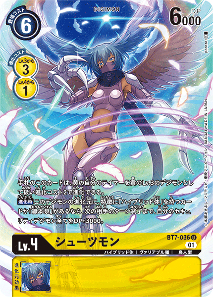 手札のこのカードは、黄の自分のテイマーを黄のLv.3のデジモンとして扱い進化コスト2で進化できる。【進化時】このデジモンの進化元に、特徴に「ハイブリッド体」を持つカードか「織本泉」があるとき、次の相手のターン終了時まで、自分のセキュリティデジモン全てのDPを+3000する。