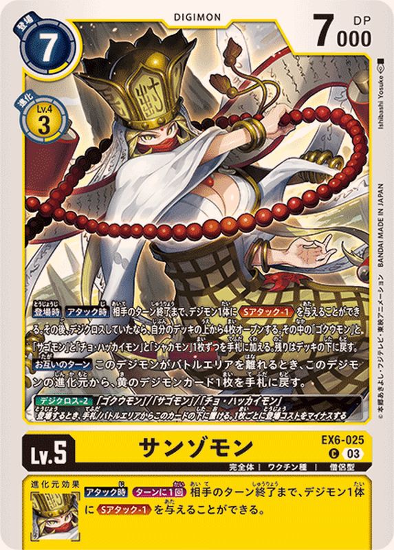 【登場時】【アタック時】相手のターン終了まで、デジモン1体に≪Sアタック-1≫を与えることができる。その後、デジクロスしていたなら、自分のデッキの上から4枚オープンする。その中の「ゴクウモン」と「サゴモン」と「チョ・ハッカイモン」と「シャカモン」1枚ずつを手札に加える。残りはデッキの下に戻す。【お互いのターン】このデジモンがバトルエリアを離れるとき、このデジモンの進化元から、黄のデジモンカード1枚を手札に戻す。「ゴクウモン」/「サゴモン」/「チョ・ハッカイモン」登場するとき、手札/バトルエリアからこのカードの下に置ける。1枚ごとに登場コストをマイナスする