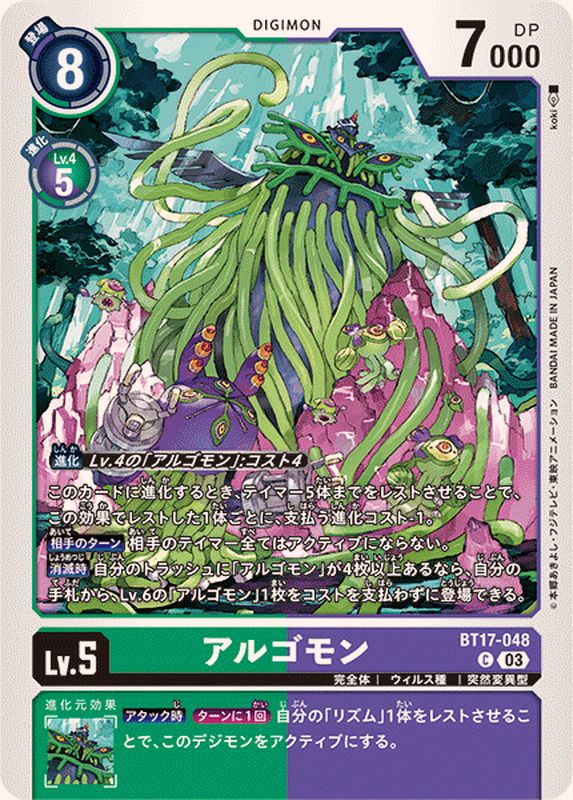 Lv.4の「アルゴモン」:コスト4このカードに進化するとき、テイマー5体までをレストさせることで、この効果でレストした1体ごとに、支払う進化コスト-1。【相手のターン】相手のテイマー全てはアクティブにならない。【消滅時】自分のトラッシュに「アルゴモン」が4枚以上あるなら、自分の手札から、Lv.6の「アルゴモン」1枚をコストを支払わずに登場できる。