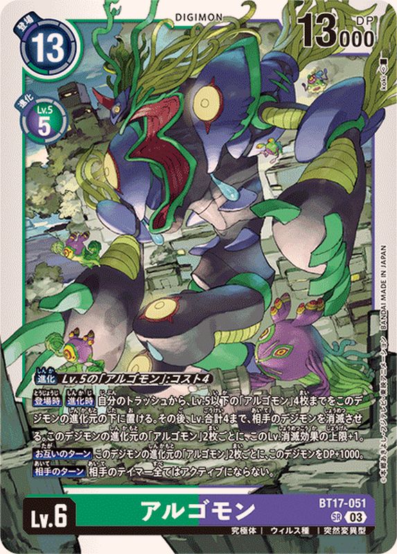 Lv.5の「アルゴモン」:コスト4【登場時】【進化時】自分のトラッシュから、Lv.5以下の「アルゴモン」4枚までをこのデジモンの進化元の下に置ける。その後、Lv.合計4まで、相手のデジモンを消滅させる。このデジモンの進化元の「アルゴモン」2枚ごとに、このLv.消滅効果の上限+1。【お互いのターン】このデジモンの進化元の「アルゴモン」2枚ごとに、このデジモンをDP+1000。【相手のターン】相手のテイマー全てはアクティブにならない。