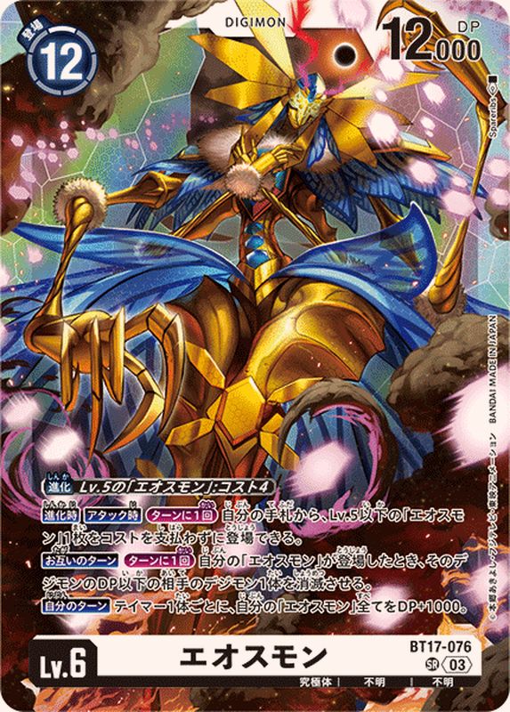 Lv.5の「エオスモン」:コスト4【進化時】【アタック時】[ターンに1回]自分の手札から、Lv.5以下の「エオスモン」1枚をコストを支払わずに登場できる。【お互いのターン】[ターンに1回]自分の「エオスモン」が登場したとき、そのデジモンのDP以下の相手のデジモン1体を消滅させる。【自分のターン】テイマー1体ごとに、自分の「エオスモン」全てをDP+1000。