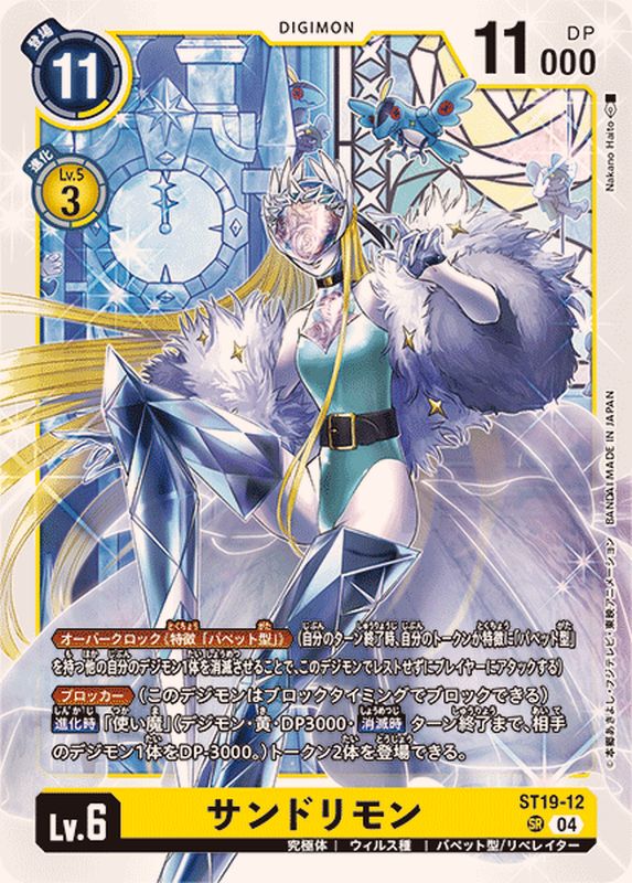 ≪オーバークロック《特徴「パペット型」》≫(自分のターン終了時、自分のトークンか特徴に「パペット型」を持つ他の自分のデジモン1体を消滅させることで、このデジモンでレストせずにプレイヤーにアタックする)≪ブロッカー≫(このデジモンはブロックタイミングでブロックできる)【進化時】「使い魔」(デジモン・黄・DP3000・【消滅時】ターン終了まで、相手のデジモン1体をDP-3000。)トークン2体を登場できる。