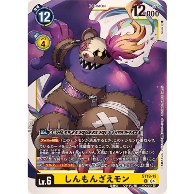 名称に「もんざえモン」/「ヌメモン」を含むLv.5:コスト3≪アーマー解除≫(このデジモンが消滅するとき、このデジモンに重ねられているカードを上から1枚破棄することで、消滅しない)【登場時】【進化時】自分のトラッシュから、名称に「ヌメモン」を含むか特徴に「パペット型」を持つLv.5以下のカード1枚をこのデジモンの進化元の下に置くことで、≪リカバリー+1《デッキ》≫(自分のデッキの上から1枚をセキュリティの上に置く)。