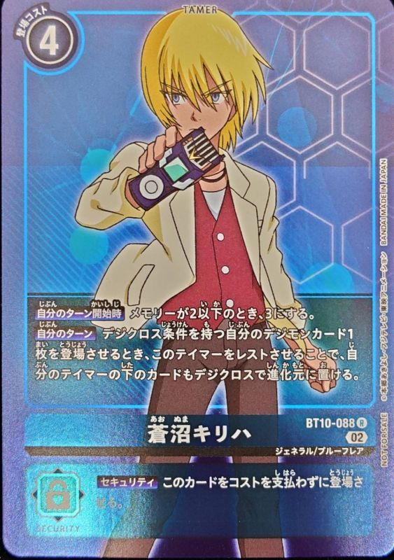 【自分のターン開始時】メモリーが2以下のとき、3にする。【自分のターン】デジクロス条件を持つ自分のデジモンカード1枚を登場させるとき、このテイマーをレストさせることで、自分のテイマーの下のカードもデジクロスで進化元に置ける。