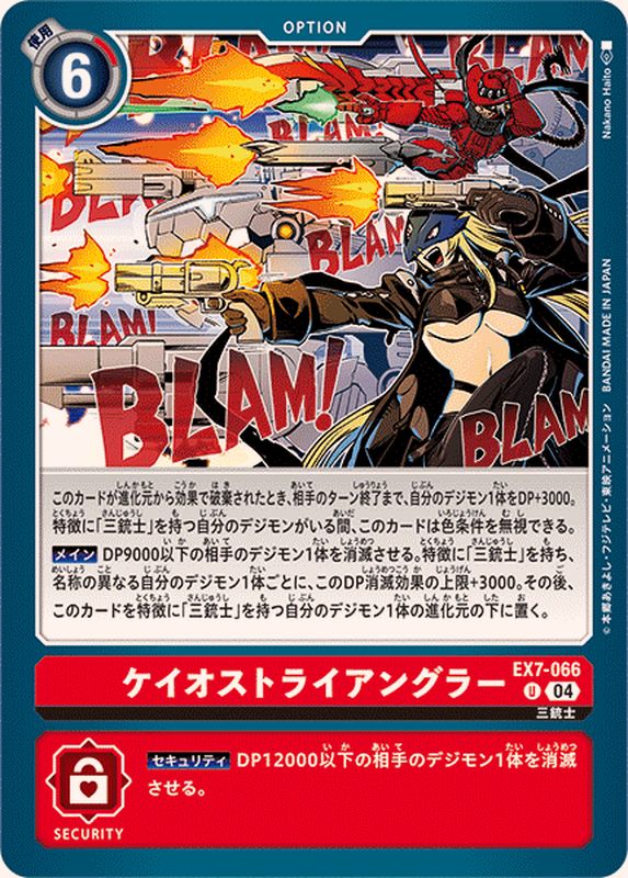 このカードが進化元から効果で破棄されたとき、相手のターン終了まで、自分のデジモン1体をDP+3000。特徴に「三銃士」を持つ自分のデジモンがいる間、このカードは色条件を無視できる。【メイン】DP9000以下の相手のデジモン1体を消滅させる。特徴に「三銃士」を持ち、名称の異なる自分のデジモン1体ごとに、このDP消滅効果の上限+3000。その後、このカードを特徴に「三銃士」を持つ自分のデジモン1体の進化元の下に置く。