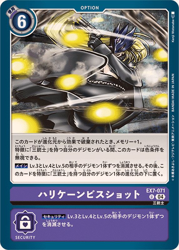 このカードが進化元から効果で破棄されたとき、メモリー+1。特徴に「三銃士」を持つ自分のデジモンがいる間、このカードは色条件を無視できる。【メイン】Lv.3とLv.4とLv.5の相手のデジモン1体ずつを消滅させる。その後、このカードを特徴に「三銃士」を持つ自分のデジモン1体の進化元の下に置く。