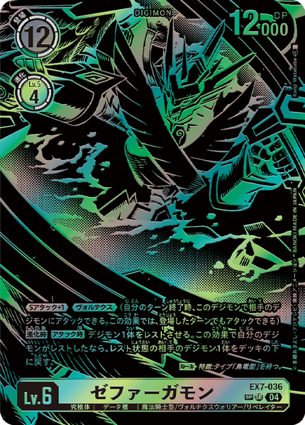 ≪Sアタック+1≫≪ヴォルテクス≫(自分のターン終了時、このデジモンで相手のデジモンにアタックできる。この効果では、登場したターンでもアタックできる)【進化時】【アタック時】デジモン1体をレストさせる。この効果で自分のデジモンがレストしたなら、レスト状態の相手のデジモン1体をデッキの下に戻す。〈ルール〉特徴:タイプ「鳥竜型」を持つ。