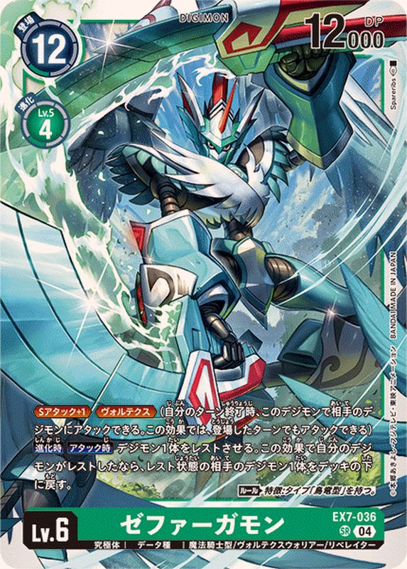 ≪Sアタック+1≫≪ヴォルテクス≫(自分のターン終了時、このデジモンで相手のデジモンにアタックできる。この効果では、登場したターンでもアタックできる)【進化時】【アタック時】デジモン1体をレストさせる。この効果で自分のデジモンがレストしたなら、レスト状態の相手のデジモン1体をデッキの下に戻す。〈ルール〉特徴:タイプ「鳥竜型」を持つ。