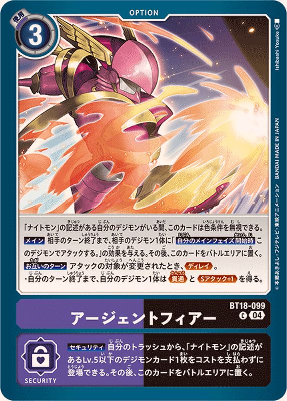 【セキュリティ】自分のトラッシュから、「ナイトモン」の記述があるLv.5以下のデジモンカード1枚をコストを支払わずに登場できる。その後、このカードをバトルエリアに置く。