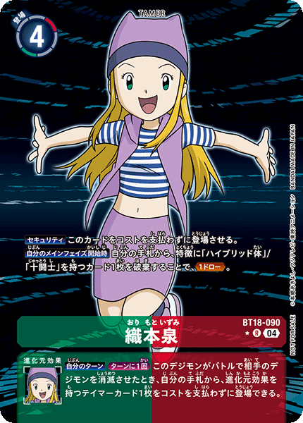 【自分のターン】[ターンに1回]このデジモンがバトルで相手のデジモンを消滅させたとき、自分の手札から、進化元効果を持つテイマーカード1枚をコストを支払わずに登場できる。