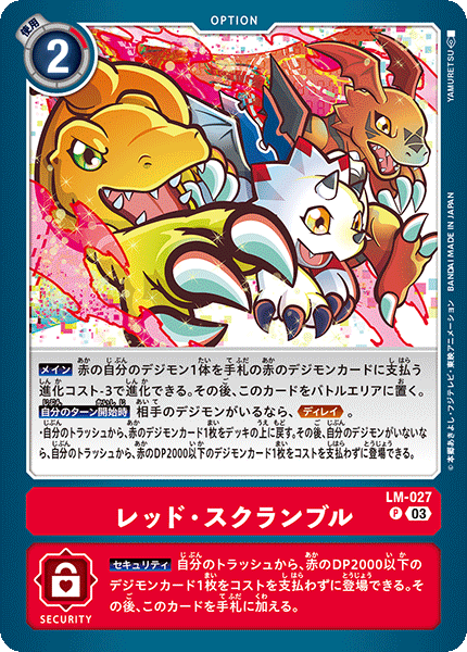 ・自分のトラッシュから、赤のデジモンカード1枚をデッキの上に戻す。その後、自分のデジモンがいないなら、自分のトラッシュから、赤のDP2000以下のデジモンカード1枚をコストを支払わずに登場できる。
