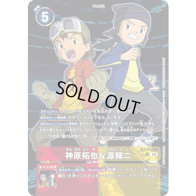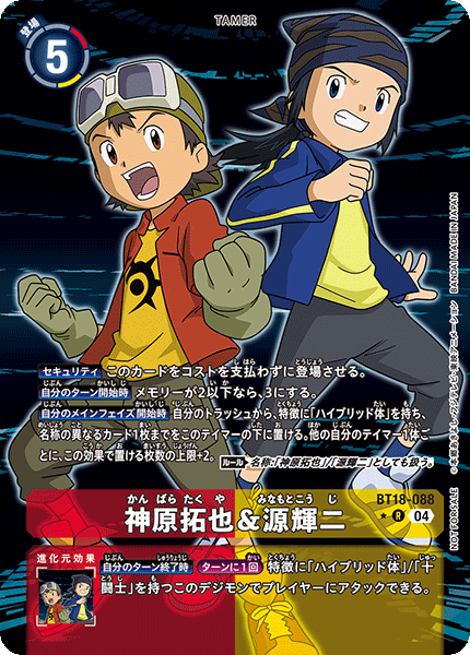 【セキュリティ】このカードをコストを支払わずに登場させる。【自分のターン開始時】メモリーが2以下なら、3にする。【自分のメインフェイズ開始時】自分のトラッシュから、特徴に「ハイブリッド体」を持ち、名称の異なるカード1枚までをこのテイマーの下に置ける。他の自分のテイマー1体ごとに、この効果で置ける枚数の上限+2。〈ルール〉名称:「神原拓也」/「源輝二」としても扱う。
