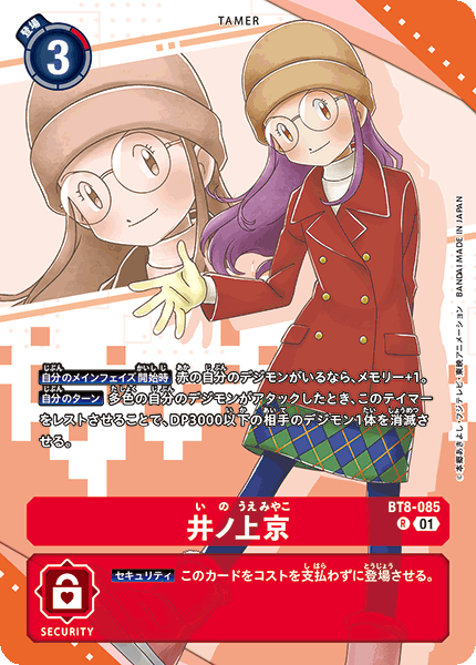【自分のメインフェイズ開始時】赤の自分のデジモンがいるとき、メモリー+1。【自分のターン】2色以上の自分のデジモンがアタックしたとき、このテイマーをレストさせることで、DP3000以下の相手のデジモン1体を消滅させる。