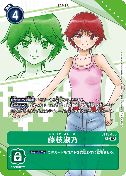 【自分のターン開始時】メモリーが2以下なら、3にする。【自分のターン】自分のデジモンが特徴に「植物型」か「妖精型」を含むデジモンに進化したとき、このテイマーをレストさせることで、メモリー+1。