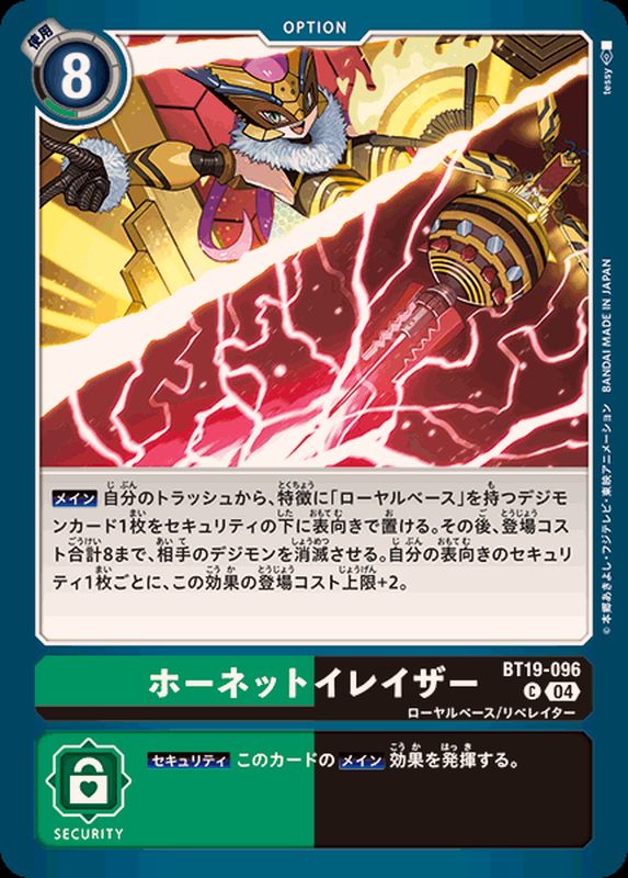【メイン】自分のトラッシュから、特徴に「ローヤルベース」を持つデジモンカード1枚をセキュリティの下に表向きで置ける。その後、登場コスト合計8まで、相手のデジモンを消滅させる。自分の表向きのセキュリティ1枚ごとに、この効果の登場コスト上限+2。