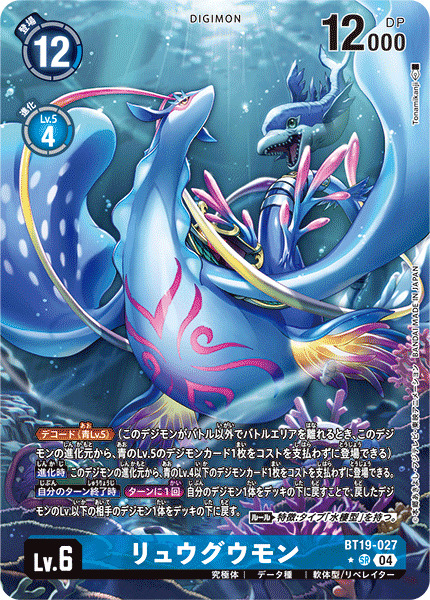 ≪デコード《青Lv.5》≫(このデジモンがバトル以外でバトルエリアを離れるとき、このデジモンの進化元から、青のLv.5のデジモンカード1枚をコストを支払わずに登場できる)【進化時】このデジモンの進化元から、青のLv.4以下のデジモンカード1枚をコストを支払わずに登場できる。【自分のターン終了時】[ターンに1回]自分のデジモン1体をデッキの下に戻すことで、戻したデジモンのLv.以下の相手のデジモン1体をデッキの下に戻す。〈ルール〉特徴:タイプ「水棲型」を持つ。