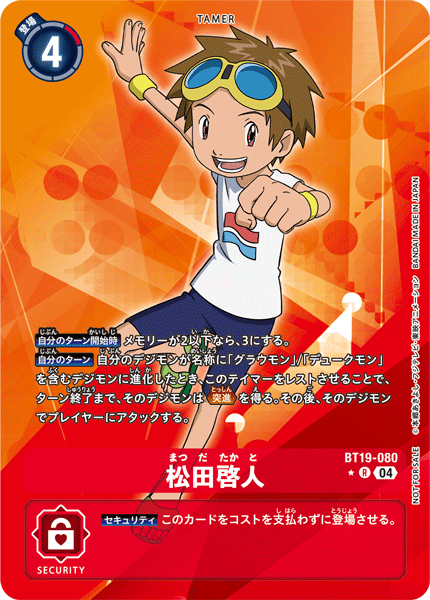 【自分のターン開始時】メモリーが2以下なら、3にする。【自分のターン】自分のデジモンが名称に「グラウモン」/「デュークモン」を含むデジモンに進化したとき、このテイマーをレストさせることで、ターン終了まで、そのデジモンは≪突進≫を得る。その後、そのデジモンでプレイヤーにアタックする。