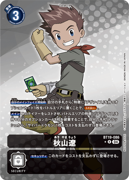 【自分のメインフェイズ開始時】自分の手札から、特徴に「デヴァイス」を持つオプションカード1枚をバトルエリアに置くことで、≪1ドロー≫。【メイン】このテイマーをレストさせ、バトルエリアの特徴に「デヴァイス」を持つ自分のオプションカード4枚を破棄することで、自分の手札/トラッシュから、「サイバードラモン」1枚をコストを支払わずに登場できる。