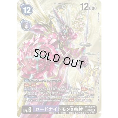 「ロードナイトモン」:コスト1≪衝突≫≪貫通≫【進化時】相手のデジモン1体を自分のデジモン1体ごとに、≪退化1≫。その後、相手のターン終了まで、相手のデジモン1体は進化できない。【お互いのターン】このデジモンの進化元に「ロードナイトモン」/「X抗体」がある間、「ナイトモン」の記述がある自分のデジモン全ては≪連携≫を得て、DP+3000。