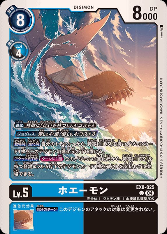 特徴に「DS」を持つLv.4:コスト3〔ジョグレス〕青Lv.4+黒/紫Lv.4:コスト0【登場時】【進化時】自分のトラッシュから、特徴に「DS」を持つデジモンカード1枚をこのデジモンの進化元の下に置ける。【アタック終了時】[ターンに1回]このデジモンの進化元から、特徴に「DS」を持つ登場コスト5以下のデジモンカード1枚をコストを支払わずに登場できる。