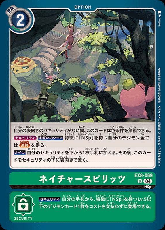 【セキュリティ】自分の手札から、特徴に「NSp」を持つLv.5以下のデジモンカード1枚をコストを支払わずに登場できる。