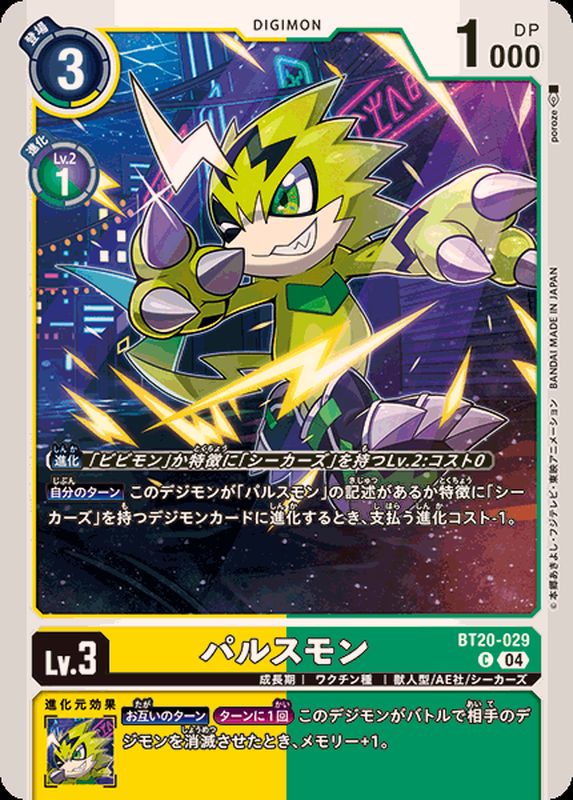 「ビビモン」か特徴に「シーカーズ」を持つLv.2:コスト0【自分のターン】このデジモンが「パルスモン」の記述があるか特徴に「シーカーズ」を持つデジモンカードに進化するとき、支払う進化コスト-1。