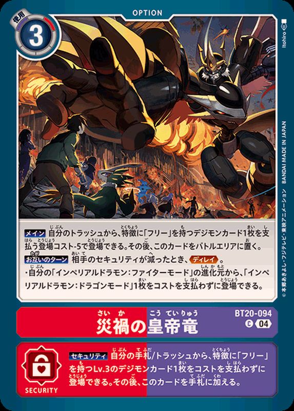 【メイン】自分のトラッシュから、特徴に「フリー」を持つデジモンカード1枚を支払う登場コスト-5で登場できる。その後、このカードをバトルエリアに置く。【お互いのターン】相手のセキュリティが減ったとき、≪ディレイ≫。・自分の「インペリアルドラモン:ファイターモード」の進化元から、「インペリアルドラモン:ドラゴンモード」1枚をコストを支払わずに登場できる。