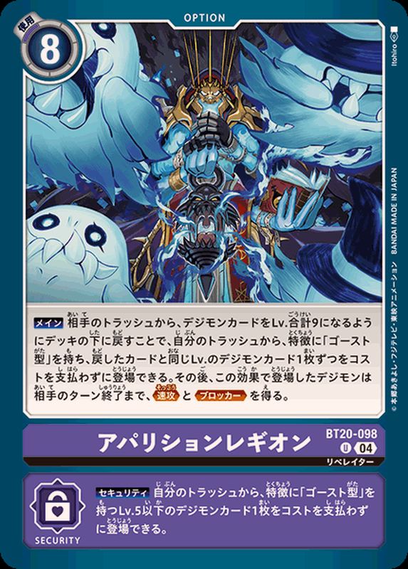 【メイン】相手のトラッシュから、デジモンカードをLv.合計9になるようにデッキの下に戻すことで、自分のトラッシュから、特徴に「ゴースト型」を持ち、戻したカードと同じLv.のデジモンカード1枚ずつをコストを支払わずに登場できる。その後、この効果で登場したデジモンは相手のターン終了まで、≪速攻≫と≪ブロッカー≫を得る。