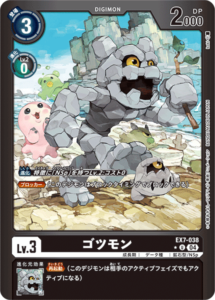 特徴に「NSp」を持つLv.2:コスト0≪ブロッカー≫(このデジモンはブロックタイミングでブロックできる)