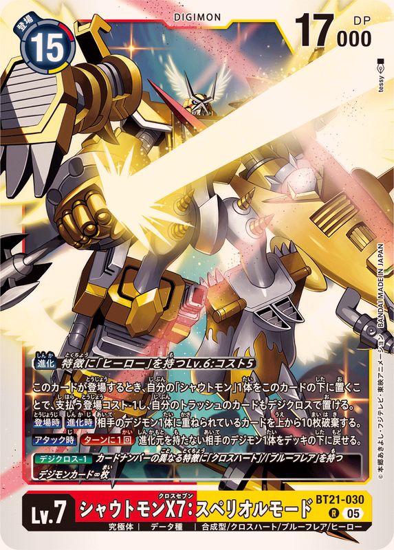 〔進化〕特徴に「ヒーロー」を持つLv.6:コスト5このカードが登場するとき、自分の「シャウトモン」1体をこのカードの下に置くことで、支払う登場コスト-1し、自分のトラッシュのカードもデジクロスで置ける。【登場時】【進化時】相手のデジモン1体に重ねられているカードを上から10枚破棄する。【アタック時】[ターンに1回]進化元を持たない相手のデジモン1体をデッキの下に戻せる。デジクロス-1:カードナンバーの異なる特徴に「クロスハート」/「ブルーフレア」を持つデジモンカード∞枚