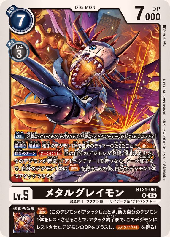 〔進化〕名称に「グレイモン」を含むLv.4/特徴に「アドベンチャー」を持つLv.4:コスト3【登場時】【進化時】相手のデジモン1体を自分のテイマーの色2色ごとに、≪退化1≫。【自分のターン】[ターンに1回]他の自分のデジモンが登場/進化したとき、そのデジモンが特徴に「アドベンチャー」を持つなら、ターン終了まで、自分のデジモン1体は≪連携≫を得る。その後、自分のデジモン1体でアタックできる。≪連携≫(このデジモンがアタックしたとき、他の自分のデジモン1体をレストさせることで、アタック終了まで、このデジモンにレストさせたデジモンのDPをプラスし、≪Sアタック+1≫を得る)