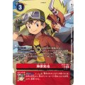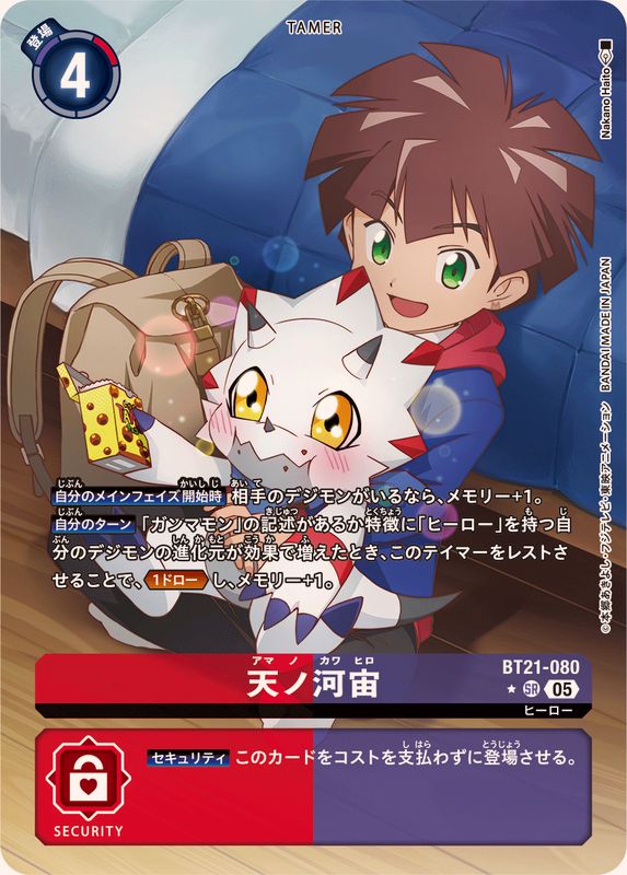 【自分のメインフェイズ開始時】相手のデジモンがいるなら、メモリー+1。【自分のターン】「ガンマモン」の記述があるか特徴に「ヒーロー」を持つ自分のデジモンの進化元が効果で増えたとき、このテイマーをレストさせることで、≪1ドロー≫し、メモリー+1。【セキュリティ】このカードをコストを支払わずに登場させる。