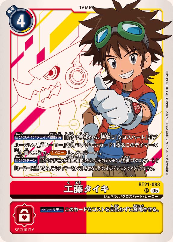 【自分のメインフェイズ開始時】自分の手札から、特徴に「クロスハート」/「ブルーフレア」/「ヒーロー」を持つデジモンカード1枚をこのテイマーの下に置くことで、≪1ドロー≫し、メモリー+1。【自分のターン】自分のデジモンが登場/進化したとき、そのデジモンが特徴に「クロスハート」/「ヒーロー」を持つなら、このテイマーをレストさせることで、そのデジモンでアタックできる。【セキュリティ】このカードをコストを支払わずに登場させる。