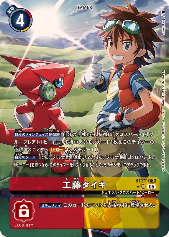 【自分のメインフェイズ開始時】自分の手札から、特徴に「クロスハート」/「ブルーフレア」/「ヒーロー」を持つデジモンカード1枚をこのテイマーの下に置くことで、≪1ドロー≫し、メモリー+1。【自分のターン】自分のデジモンが登場/進化したとき、そのデジモンが特徴に「クロスハート」/「ヒーロー」を持つなら、このテイマーをレストさせることで、そのデジモンでアタックできる。【セキュリティ】このカードをコストを支払わずに登場させる。
