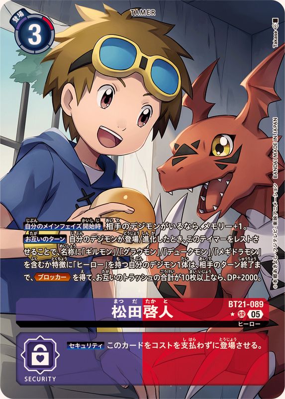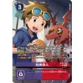 【自分のメインフェイズ開始時】相手のデジモンがいるなら、メモリー+1。【お互いのターン】自分のデジモンが登場/進化したとき、このテイマーをレストさせることで、名称に「ギルモン」/「グラウモン」/「デュークモン」/「メギドラモン」を含むか特徴に「ヒーロー」を持つ自分のデジモン1体は、相手のターン終了まで、≪ブロッカー≫を得て、お互いのトラッシュの合計が10枚以上なら、DP+2000。【セキュリティ】このカードをコストを支払わずに登場させる。