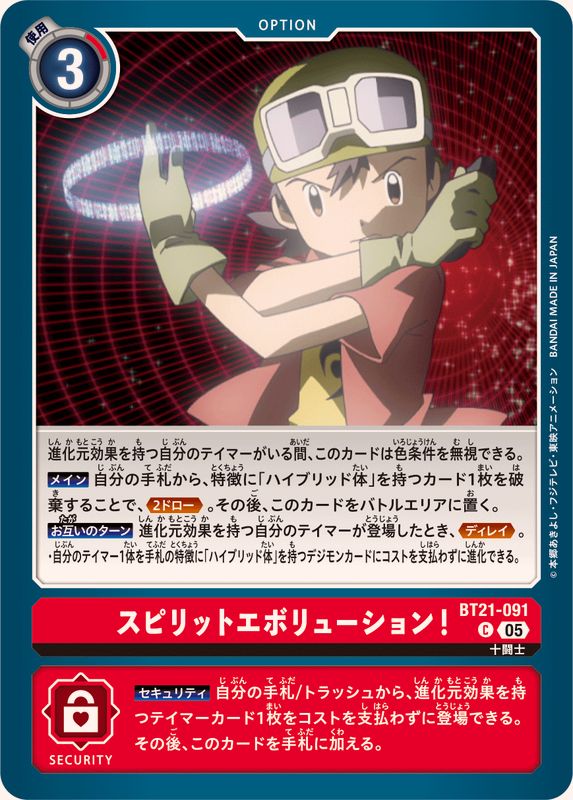 進化元効果を持つ自分のテイマーがいる間、このカードは色条件を無視できる。【メイン】自分の手札から、特徴に「ハイブリッド体」を持つカード1枚を破棄することで、≪2ドロー≫。その後、このカードをバトルエリアに置く。【お互いのターン】進化元効果を持つ自分のテイマーが登場したとき、≪ディレイ≫。・自分のテイマー1体を手札の特徴に「ハイブリッド体」を持つデジモンカードにコストを支払わずに進化できる。【セキュリティ】自分の手札/トラッシュから、進化元効果を持つテイマーカード1枚をコストを支払わずに登場できる。その後、このカードを手札に加える。