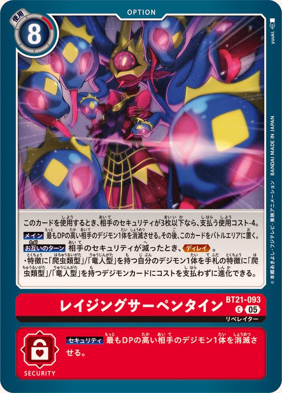 このカードを使用するとき、相手のセキュリティが3枚以下なら、支払う使用コスト-4。【メイン】最もDPの高い相手のデジモン1体を消滅させる。その後、このカードをバトルエリアに置く。【お互いのターン】相手のセキュリティが減ったとき、≪ディレイ≫。・特徴に「爬虫類型」/「竜人型」を持つ自分のデジモン1体を手札の特徴に「爬虫類型」/「竜人型」を持つデジモンカードにコストを支払わずに進化できる。【セキュリティ】最もDPの高い相手のデジモン1体を消滅させる。