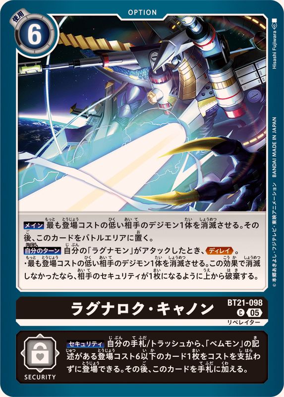 【メイン】最も登場コストの低い相手のデジモン1体を消滅させる。その後、このカードをバトルエリアに置く。【自分のターン】自分の「ラグナモン」がアタックしたとき、≪ディレイ≫。・最も登場コストの低い相手のデジモン1体を消滅させる。この効果で消滅しなかったなら、相手のセキュリティが1枚になるように上から破棄する。【セキュリティ】自分の手札/トラッシュから、「ベムモン」の記述がある登場コスト6以下のカード1枚をコストを支払わずに登場できる。その後、このカードを手札に加える。